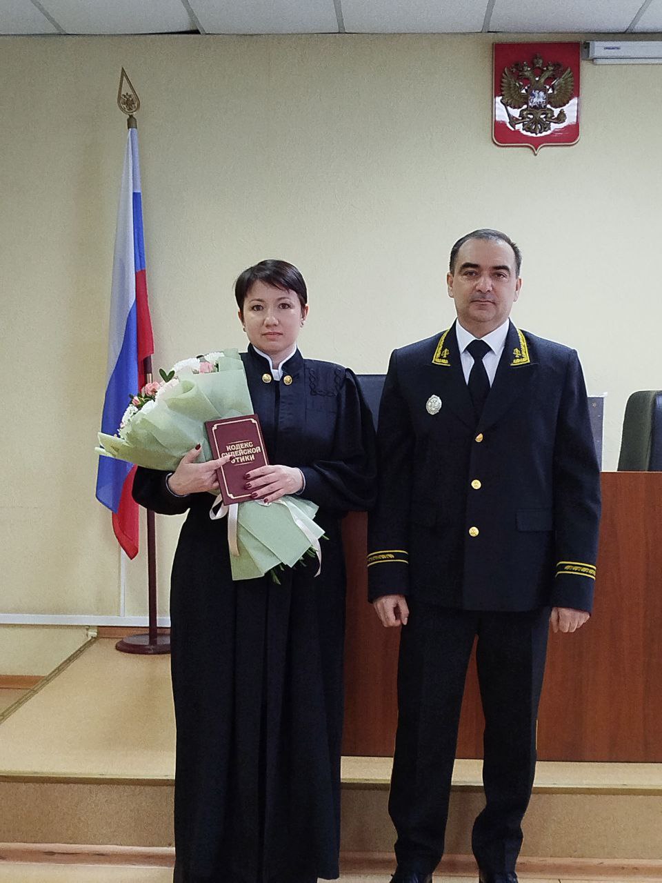 | 24 февраля 2026 г. в Минусинском городском суде состоялась торжественная церемония принесения присяги и вступления в должность судьи Минусинского городского суда Абрагимовой Натальи Раяновны, назначенной Указом Президента №93 от 16 февраля 2026г. «О назначении судей федеральных судов и о представителях Президента Российской федерации в квалификационных коллегиях судей субъектов Российской Федерации». На торжественном собрании судей Минусинского городского суда, перед государственным флагом Российской Федерации Наталья Раяновна принесла присягу. Председатель Минусинского городского суда Шабловский Александр Олегович поздравил Наталью Раяновну со вступлением в должность, вручил Кодекс судейской этики, как основополагающие правила поведения судьи, а также символы судебной деятельности: мантию, судейский молоток, пожелал успехов в отправлении правосудия. Трудовую деятельность Наталья Раяновна начинала в 2003г. в Минусинском городском суде секретарем судебного заседания, с 2010 по 2021г. работала в должности помощника судьи Минусинского городского суда, затем Наталья Раяновна продолжила трудовую деятельность помощником прокурора Краснотуранского района Красноярского края и теперь вернулась в родной суд, но уже в должности судьи. Коллектив Минусинского о городского суда желает успехов Наталье Раяновне в работе по отправлению правосудия! ![]() |